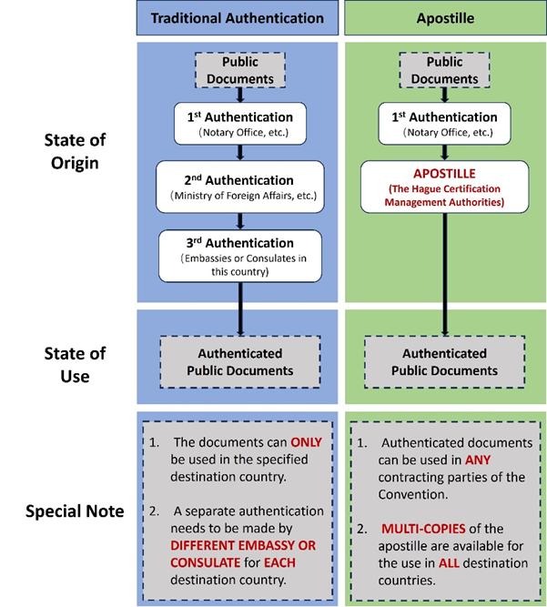 Certification under this traditional model used to require "three-step certification", or even "five-step certification" when the documents were to be delivered to some specific countries. More detailly, certification of documents started with notarization by notary offices in the country of origin, followed by the certification by the Ministry of Justice or Ministry of Foreign Affairs if required. After going through the certification procedure, the documents then were transferred to the embassy or consulates of the country of destination for further processes. In some cases, the legalization Ministry of Foreign Affairs of the country where the document would be used was needed in addition to all the steps. The whole process was complex and might take at least one month or even longer, costing a great amount of energy and money. In addition, embassy or consular authentication can only be used in one country. In other words, if the documents are to be sent to different countries, a separate certification needs to be obtained for every receiving country.